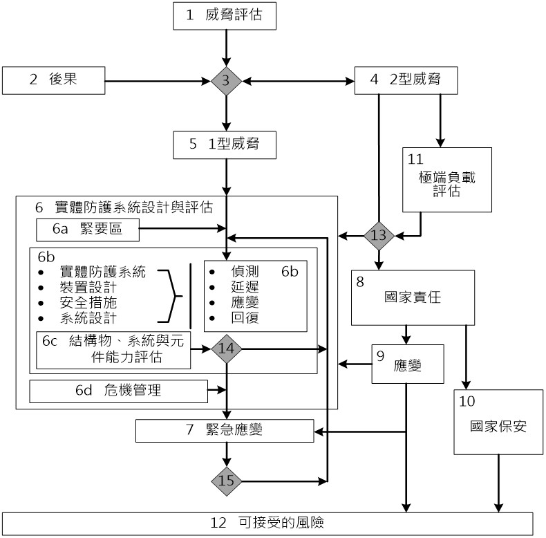 上面這張圖是國際原子能總署(IAEA)核子保安系統叢書No. 4的內容翻譯而來,在諸多文獻中,個人認為最容易解釋設施安全防護的風險管理機制,也最能讓所有牽涉到的議題一目了然。