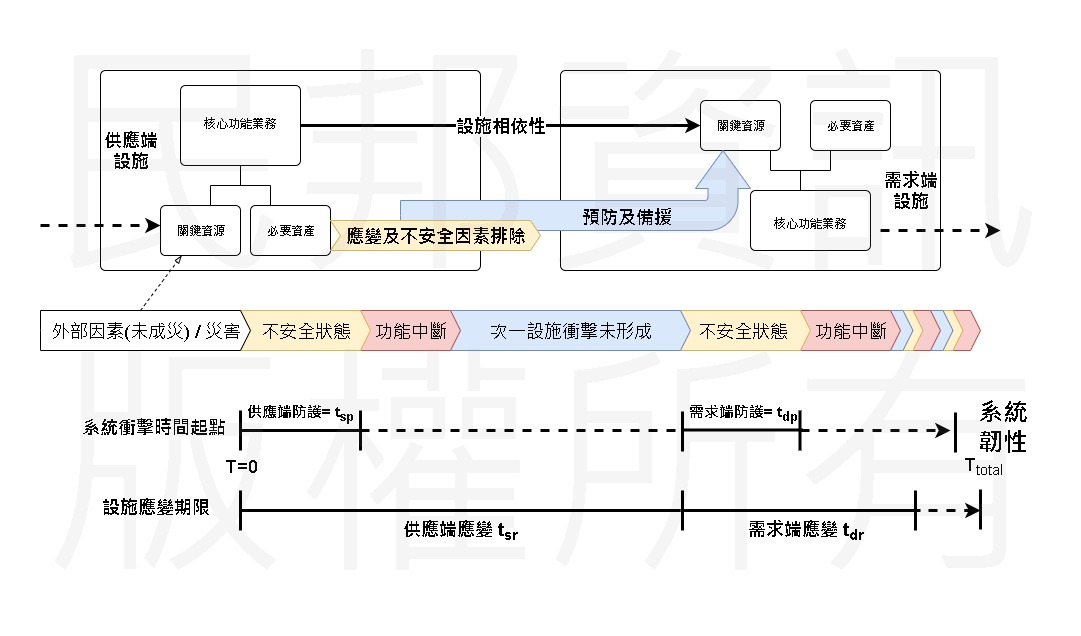 系統韌性評估的起始點是供應鏈中任一環的關鍵資源無法正常取得(在上圖中表示為供應端無法取得其所需的關鍵資源),從而評估其下游供應鏈成員的總體安全防護與應變的能力,以下依據發生時序的方式說明設施之間的關係與系統韌性的評估原則: